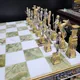 Поле шахмат выполнено из редкого и благородного оникса, сочетающего в себе оттенки белого и глубокого зеленого. Доска и фигуры, отлитые из бронзы, вручную расписаны серебром и золотом, придавая им неповторимый блеск и роскошь. Каждый элемент выполнен с исключительным вниманием к деталям, что делает эти шахматы настоящим шедевром.